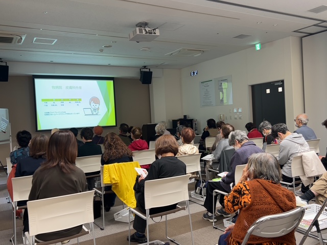 牧病院 皮膚科の信原先生をお迎えし、皮膚科医の視点から老化の原因や予防方法、牧病院で行っている美容皮膚の施術内容についてお話し頂きました。参加人数は40名弱で、約9割が女性でした。