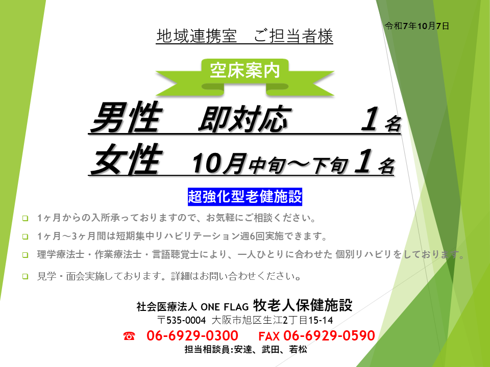 【医療・介護関係者向け】空床状況のご案内(2025年10月7日 現在)
