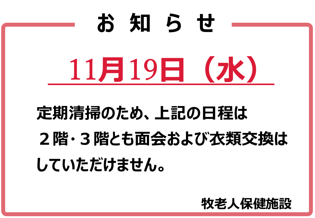 入所者様ご家族様へのお知らせ(11月 定期清掃日:面会・衣類交換なし)