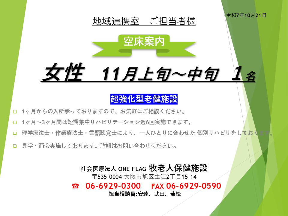 【医療・介護関係者向け】空床状況のご案内(2025年10月21日 現在)