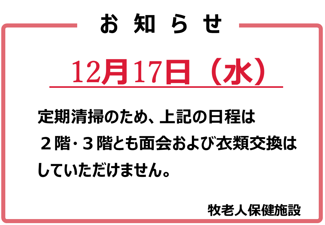 入所者様ご家族様へのお知らせ(12月 定期清掃日:面会・衣類交換なし)