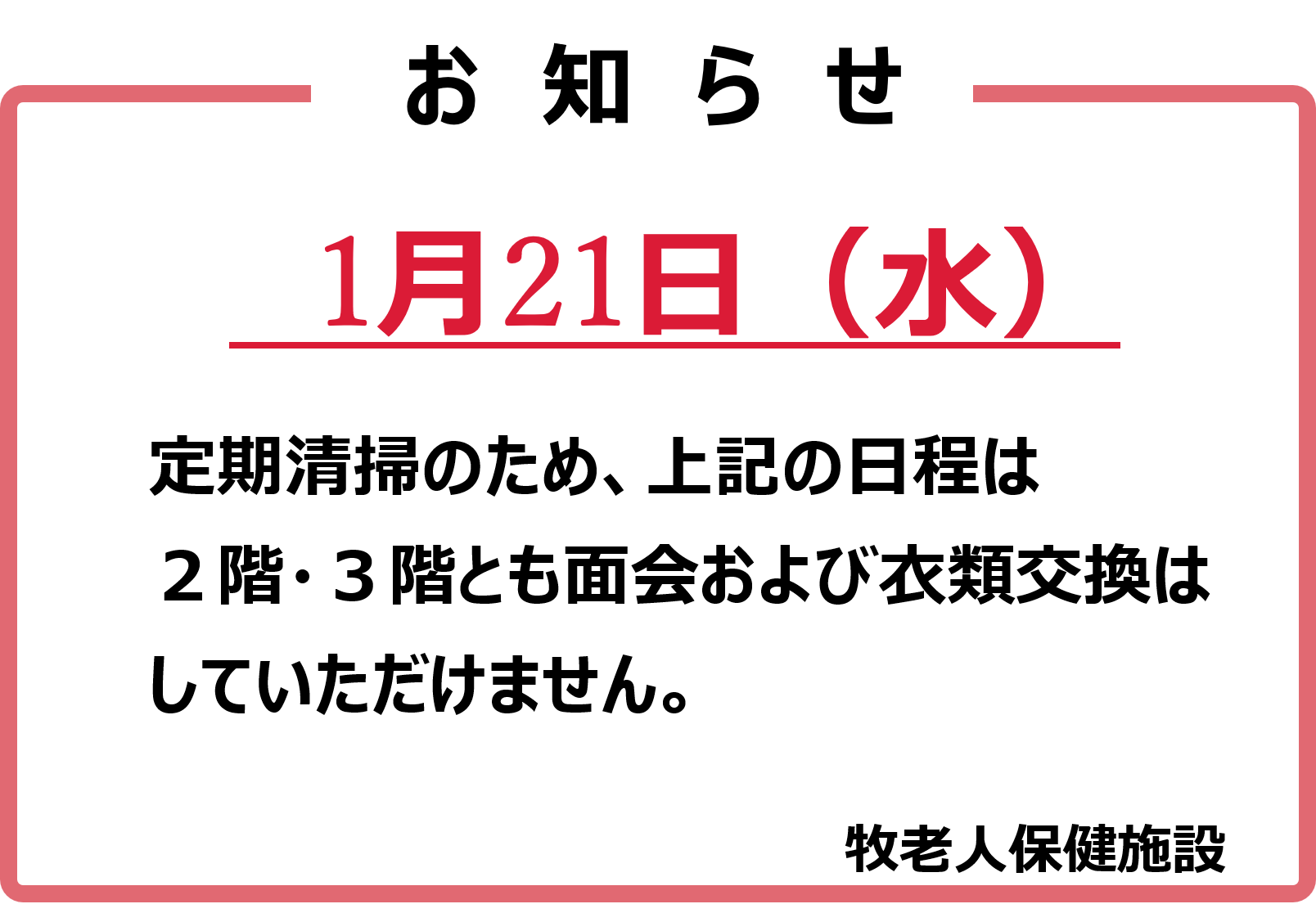 入所者様ご家族様へのお知らせ(1月 定期清掃日:面会・衣類交換はしていただけません)