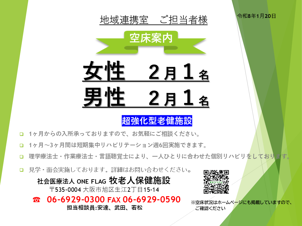 【医療・介護関係者向け】空床状況のご案内(2026年1月20日 現在)