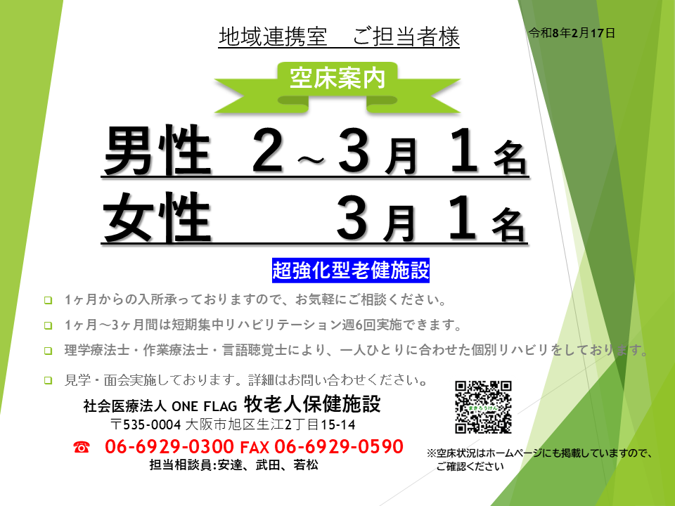 【医療・介護関係者向け】空床状況のご案内(2026年2月17日 現在)