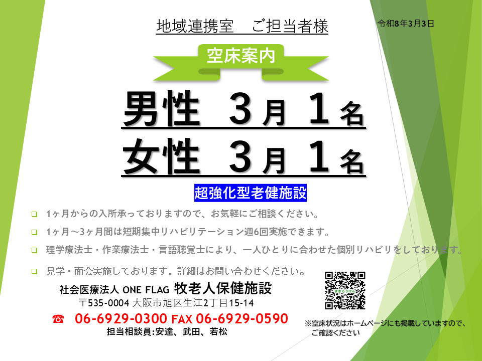 【医療・介護関係者向け】空床状況のご案内(2026年3月3日 現在)