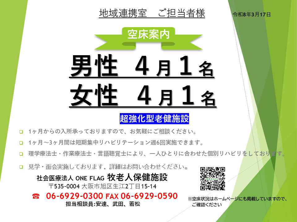 【医療・介護関係者向け】空床状況のご案内(2026年3月17日 現在)