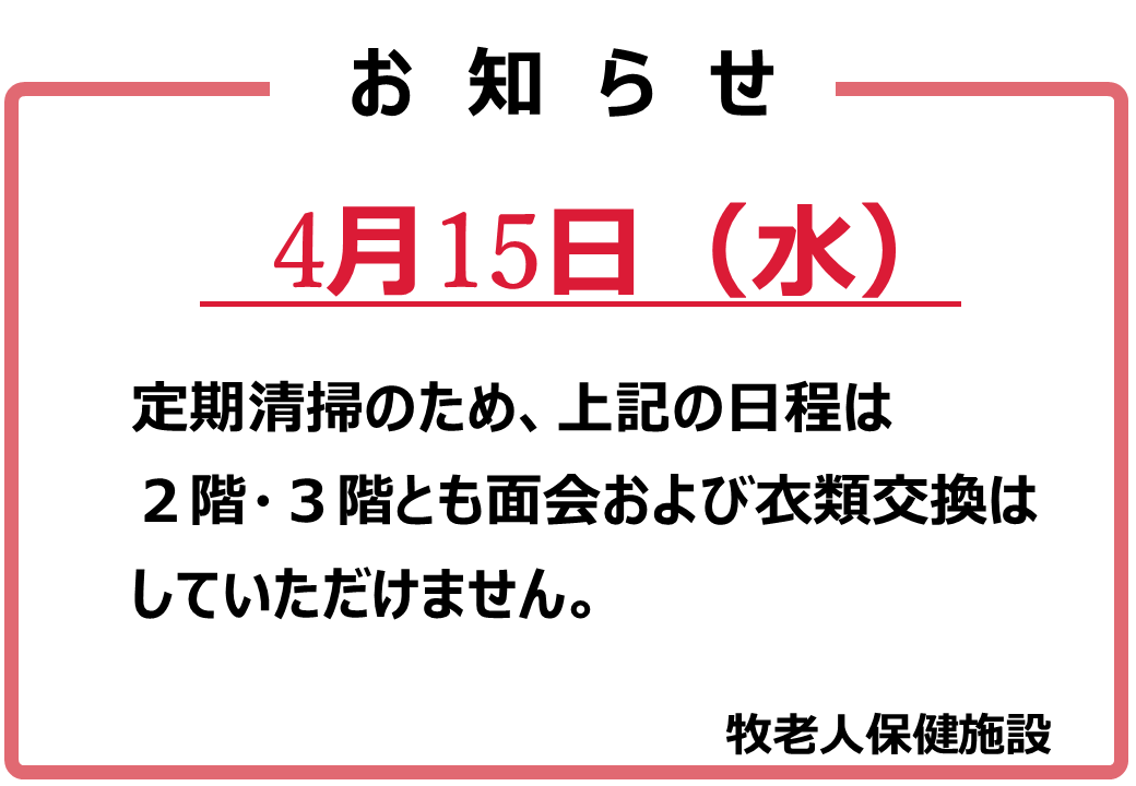 入所者様ご家族様へのお知らせ(4月 定期清掃日:面会・衣類交換はしていただけません)