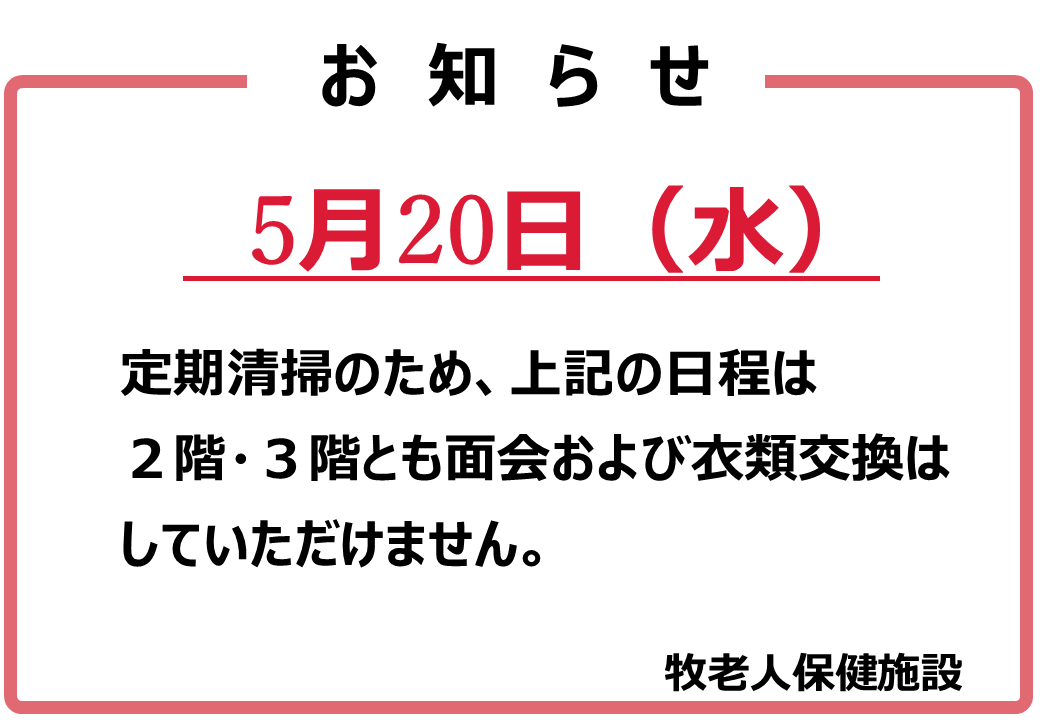 入所者様ご家族様へのお知らせ(5月 定期清掃日:面会・衣類交換はしていただけません)