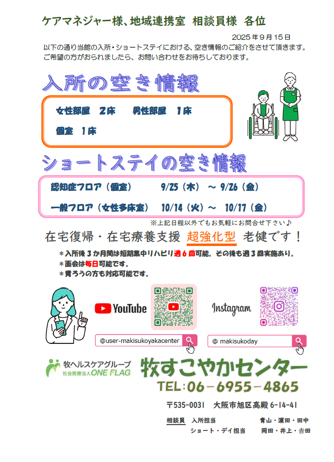 【空床情報のお知らせ 2025年9月15日現在】