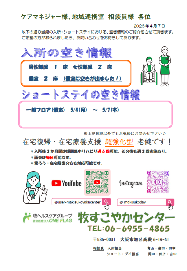 【空床情報のお知らせ 2026年4月7日現在】